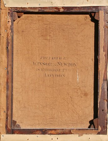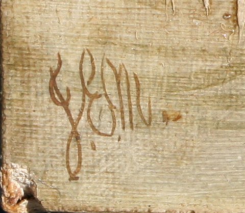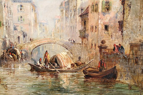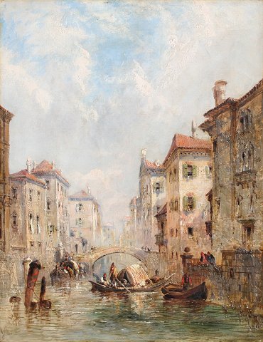 EXCEPTIONAL VENETIAN CANAL SCENE, MONOGRAMMED J.E.M.?: Oil/Canvas, 18'' x 14'', encased in period gilded gesso frame with wear, 25'' x 21 1/4''. Condition- Needs cleaning, several small punctures in lower left quadrant. A Sleeper! Est. $1500/2500**