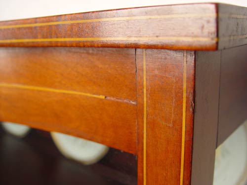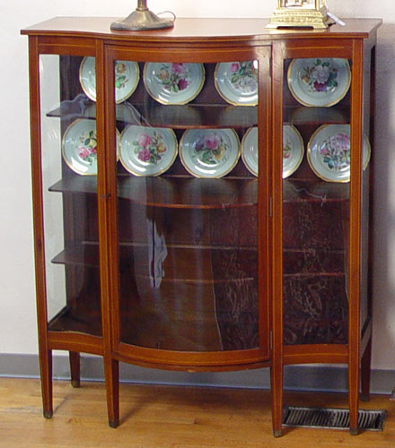 STRING INLAY MAHOGANY CHINA DISPLAY CABINET: Bowed center door, slight bows to the panels flanking the door, interior shelves with plate grooves. 59 1/4'' high x 48 1/2'' wide x 20 1/4'' deep.