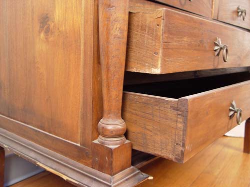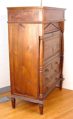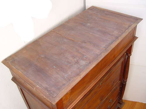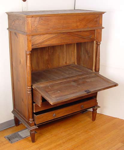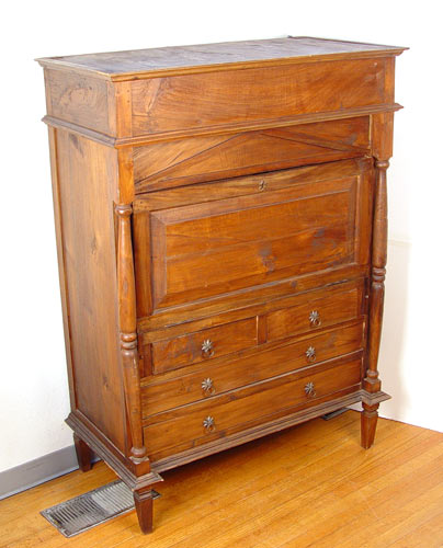 19TH C COUNTRY FRENCH ABBATANT SECRETAIRE: Fall front with support slides, interior has no cubicles or shelving. Drawers under the fall front writing surface. Measures 59'' high x 42 1/2'' wide x 21'' deep