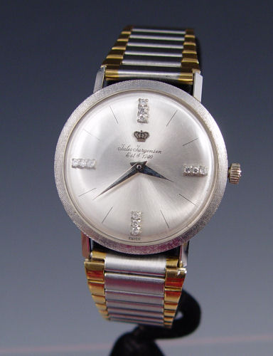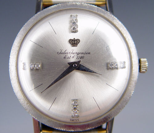 14K JULES JURGENSEN MAN'S WRISTWATCH: 14K white gold man's Jules Jurgensen wristwatch. Silver-tone round dial with diamond and painted markers. Acrylic crystal. Mechanical movement. The watch is running. Two toned non gold bracelet. Length: 8''