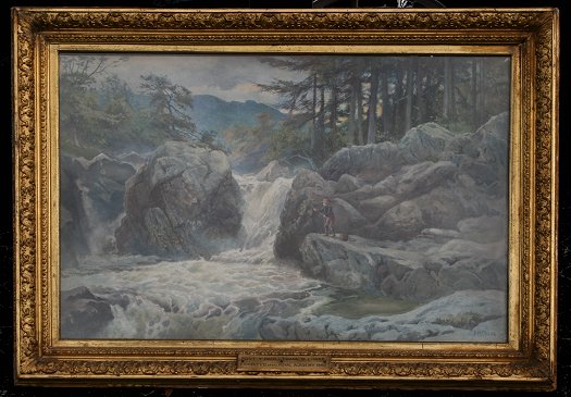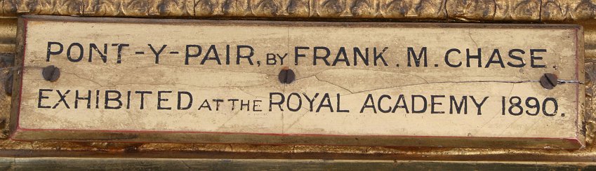 CHASE, Frank, M., (British, -1898): ''Pont Y Pair'', W/C, 22 1/2'' x 36'', signed, period gilded and carved frame with wear, 29 1/2'' x 43 1/2'', exhibition plaque affixed from the Royal Academy, 1890. Condition - Small tear upper right corner. Est. $800/2000**