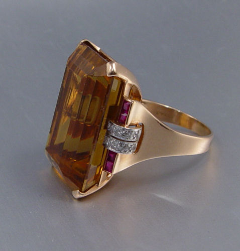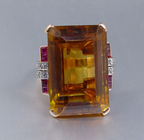14K ROSE GOLD & PLATINUM RETRO 50 CT. CITRINE RING: 14K rose gold and platinum ring contains 1 emerald cut citrine. Weight: 50.00 Ct. Approx. The citrine is rated VVS in clarity (Type I) Y (brown modifier) in Hue, 3 in Tone and 3 in Saturation. Sixteen (16) round single cut diamonds. Weight: .33 Ct. Approx. The diamonds average VS in clarity and H-I in color. 8 square cut synthetic rubies. The citrine is prong set. The diamonds are prong set in platinum trim. The rubies are channel set. Mounting weight: 11.5 grams Approx. Size: 8