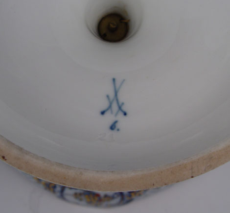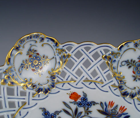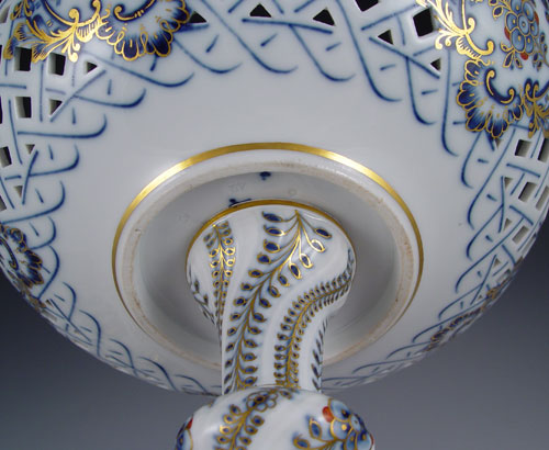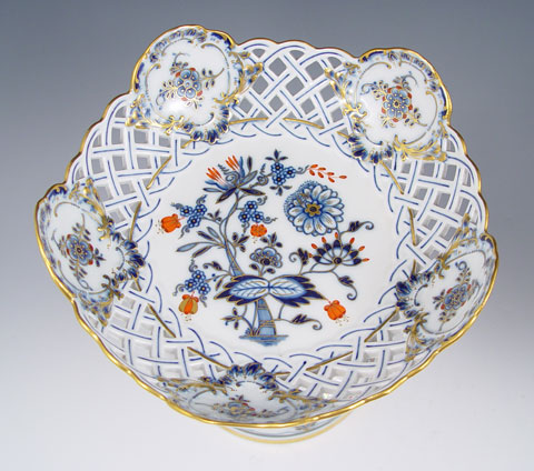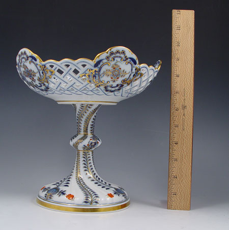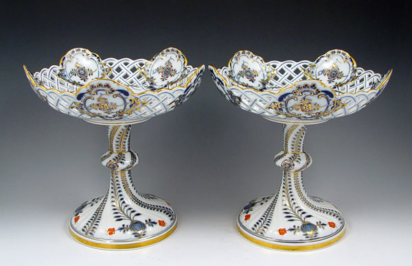 PAIR MEISSEN ''RICH ONION'' RETICULATED COMPOTES: Reticulated bowls on stands. Blue with red and gold. Blue cross sword mark. 8 3/4''h. x 9'' dia.