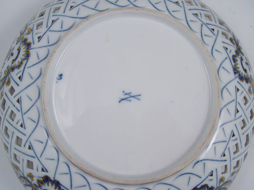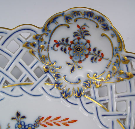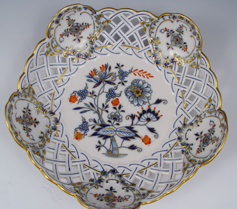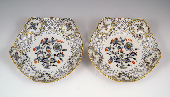 PAIR MEISSEN ''RICH ONION'' RETICULATED BOWLS: Pierced rim bowls, blue design with red and gold, blue cross swords mark. 9 7/8'' dia., 2 5/8''h.