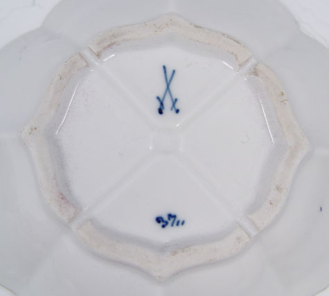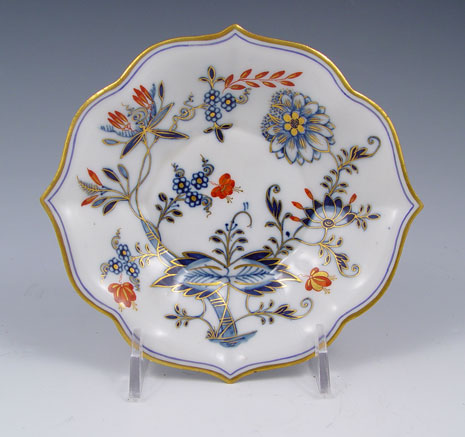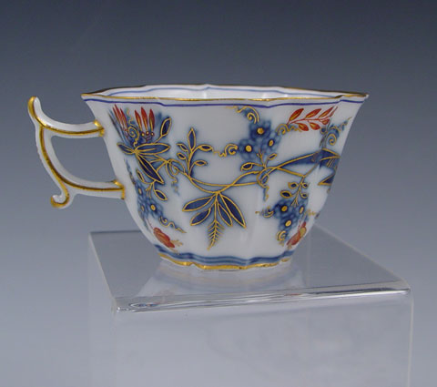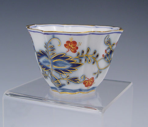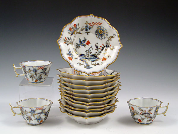 MEISSEN RICH ONION BOWLS AND CUPS: Set of 12 dessert bowls, 5'' dia. and 3 demitasse cups. Blue design with red and gold, blue cross swords mark.