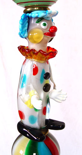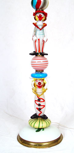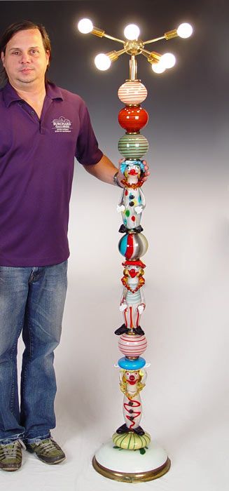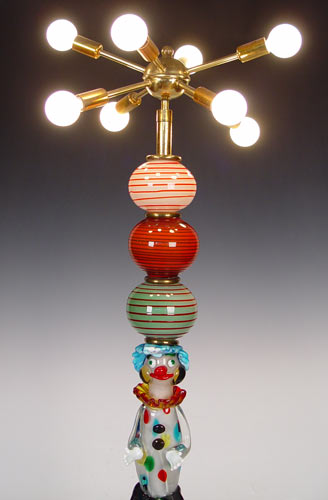 CLOWN MOTIF MURANO GLASS FLOOR LAMP: Alternating 3 glass clowns and balls. Satellite type lamp with 8 lights, note condition of brass appearance top. Please note lamp is wambly. Measures 69 1/2'' high x 12'' base dia.