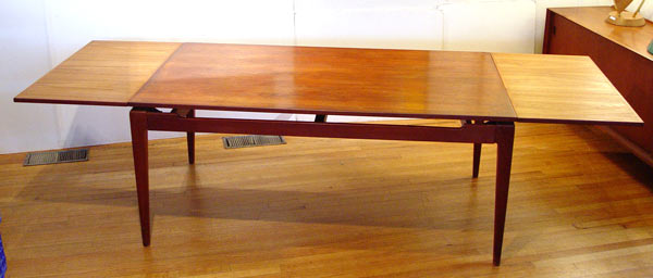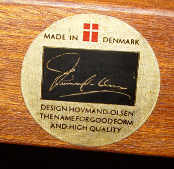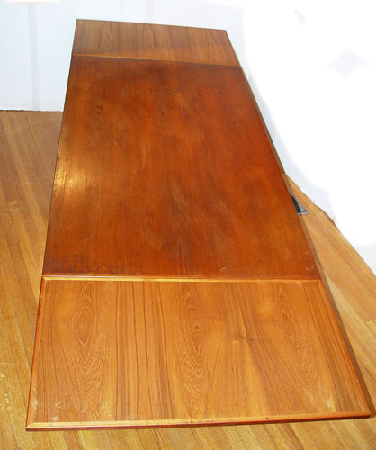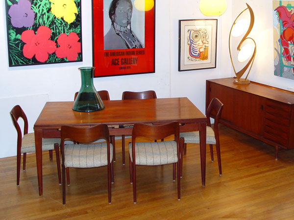HOVMAND OLSEN DESIGNED DANISH MODERN DINING TABLE AND 6 CHAIRS: Draw leaf teak table with Hovmand Olsen label, sold with the matching set of 6 chairs. Table measures 29 1/2 x 67 x 39 1/4''. The chairs are 31''h. x 19'' x 18''. Please note wood crack on one chair.