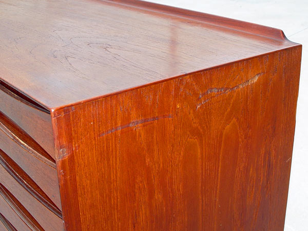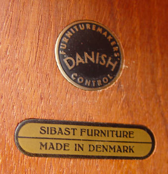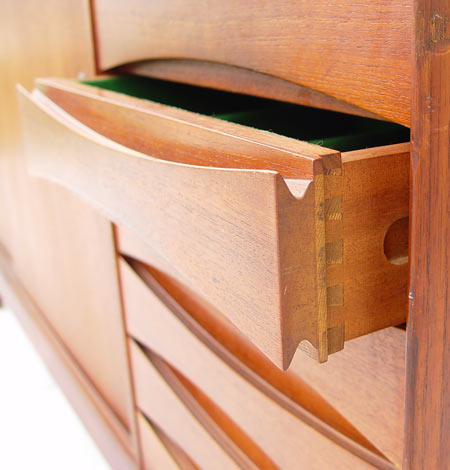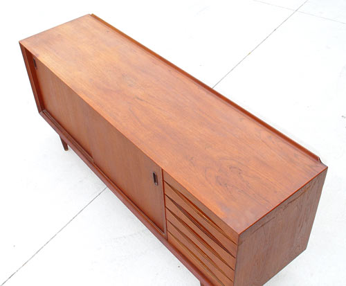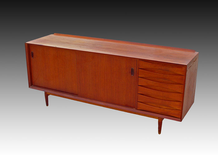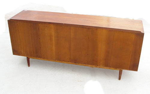 ARNE VODDER FOR SIBAST DANISH MODERN SIDEBOARD SERVER: Two sliding doors next to six drawers. Three drawers are compartmented. Lip to the back edge. 6 ft long x 30''h. x 19 1/2'' deep. Bears the Sibast label and the Danish Control disk. There is a gash on the side, a very small piece of veneer is off also.