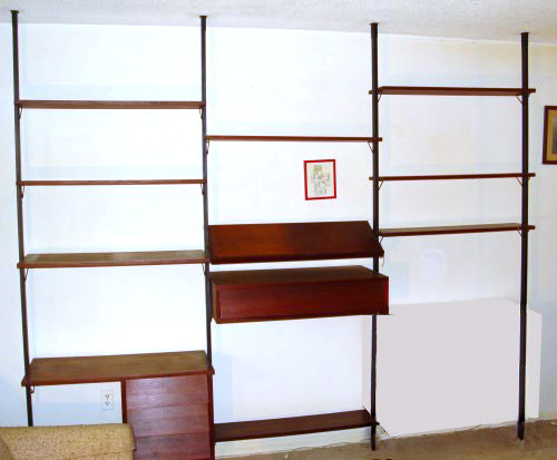 196O'S MODERN WALL UNIT - THE SWEDISH PIRA SYSTEM: Built for 8' ceilings, 4 supports go floor to ceiling with adjustable brackets for assorted shelves, cabinets and other pieces. Set breaks down for shipping but supports stay 8'.