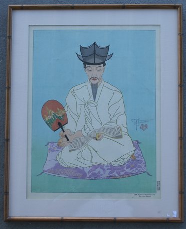 PAUL JACOULET JAPANESE WOODBLOCK PRINT, ''LES VIEUX MANUSCRITS'': Sight size 16 1/2'' x 12 3/4'', pencil signed, faux bamboo frame, 20 1/2'' x 17'', . Several minor spots of soiling, not examined out of the frame. Est. $600/900**