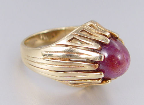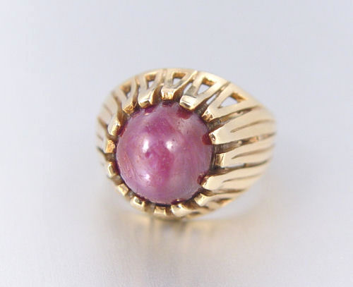 9 CT STAR RUBY CABOCHON RING: 14K yellow gold ring contains one round cabochon cut star ruby. Weight: 9.00 Ct. Approx. PR/RP in Hue, 4-5 in Tone and 2 in Saturation. Faint 6- ray star. The ruby is prong set. Weight: 9.2 grams Size: 6