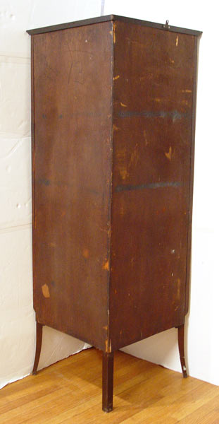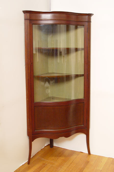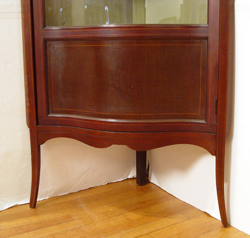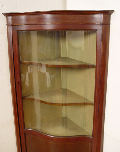 DIMINUTIVE INLAY MAHOGANY CORNER DISPLAY CABINET: Measures 64 1/4'' high x 22'' deep each side. From the estate of the granddaughter of Count Valerio Magawly-Cerati-de Calry, Dublin, Ireland, who succeeded his father in 1860.