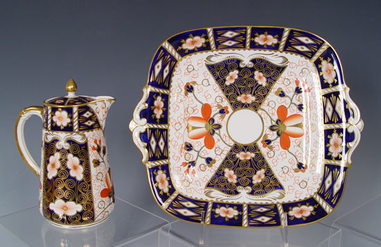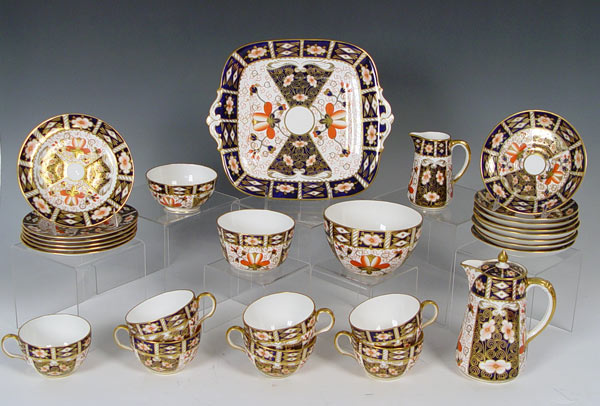 ROYAL CROWN DERBY ''TRADITIONAL IMARI'' DESSERT SET: 27 pieces to include a handled cake plate (10 3/4''), 6 plates (6 3/16''), 7 cups, 8 saucers, cream pitcher (4 1/''), bowl (5 1/4'' dia.), footed and flat open sugar bowls (4 and 4 1/2'' dia.) and a pot (6 3/4''). Derby date mark indicates Ca. 1931.
