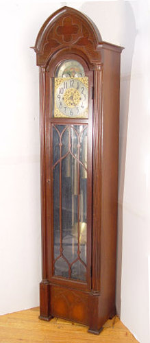 EARLY 20TH CENTURY WELBY 5 TUBE GRANDMOTHER CLOCK: Dark wood case with cathedral top. 5 tube chime. 3 weight, key and pendulum mechanism. Note finish condition. Clock currently runs, but may need adjustment. Measures 74'' high x 18 1/4'' wide x 11 1/2'' deep. Key and crank in office.