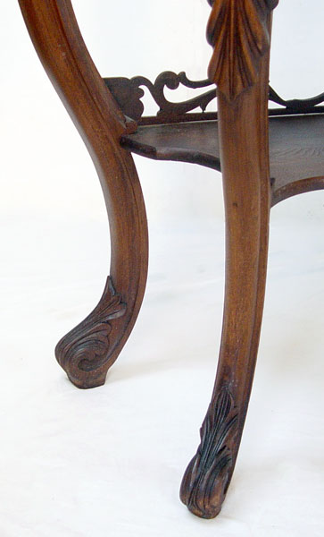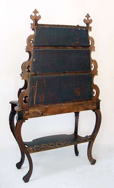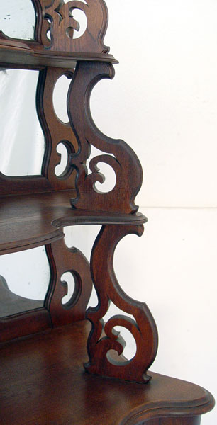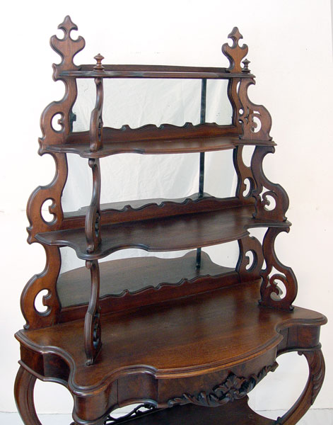VICTORIAN CARVED WALNUT FOYER STAND / ETAGERE: Finely carved one drawer table under graduating shelves. The shelves are mirror backed. Serpentine front. Curved legs joined by a shelf. Measures 70'' high x 42 1/2'' wide x 19'' deep.