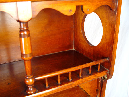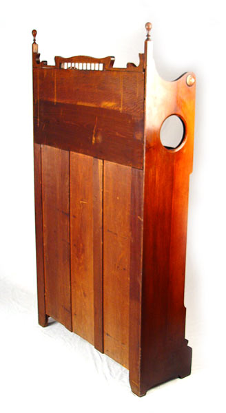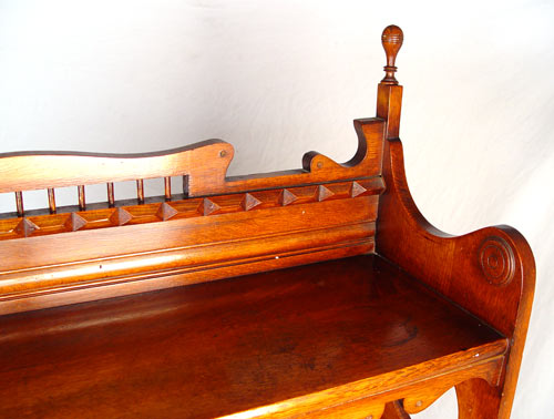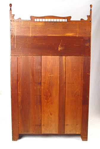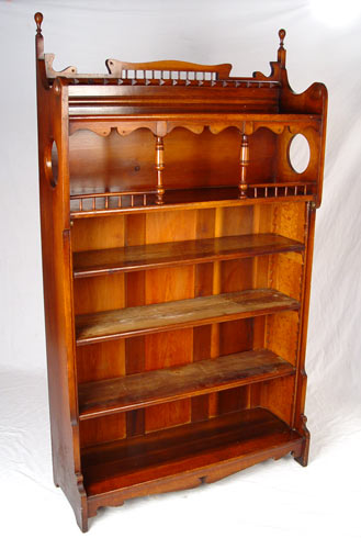 VICTORIAN OAK BOOKCASE: Oak bookshelf with gingerbread detailing. Top shelves are stationary, lower three are adjustable. Measures 64'' high x 36 1/4'' wide x 10 3/4'' deep