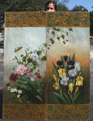 PAIR OF VICTORIAN BOTANICAL PAINTED OIL/CANVAS SCREENS: 60'' x 24'', no visible signature, unframed. Condition - Cracklure throughout, needs cleaning, several abrasions and minor paint fleck.