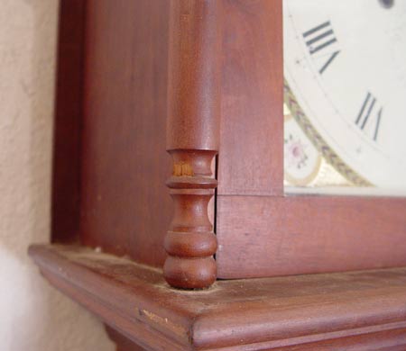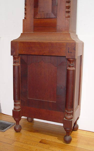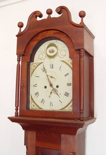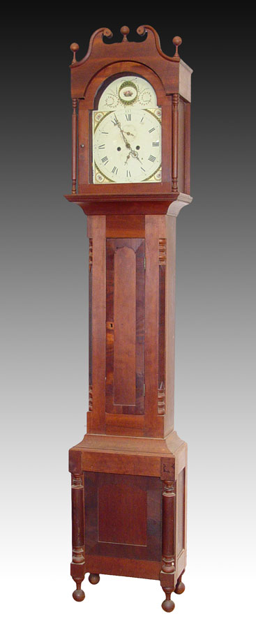 EARLY 19TH CENTURY WALKER & FINNEMORE LONGCASE CLOCK: Circa 1808-1811 with hand painted face by Walker & Finnemore (Birmingham), signed on back, illegible signature on front. Cherry case with 1/4 columns. dual weight, crank key and pendulum mechanism. Please note replaced wood on back top, works appear to be replacement with new supports on case, paint flecks and chips on face. Measures 100 1/2'' high x 19'' wide x 11 3/4'' deep.