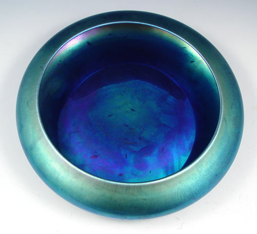 STEUBEN BLUE AURENE BOWL 2586: Blue iridescent glass. Signed Aurene 2586 with partial paper label. Measures 2 3/4'' high x 12'' dia.