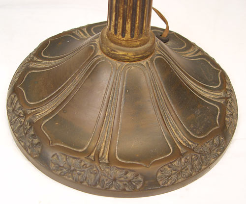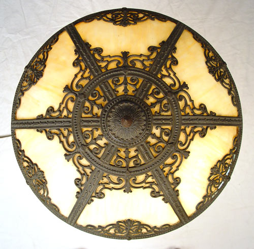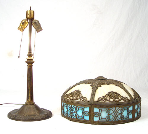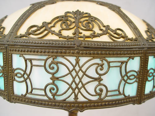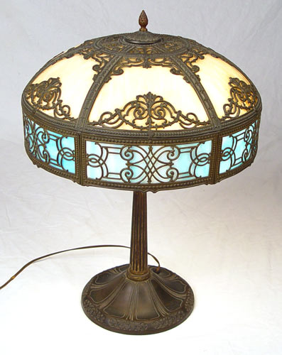 VINTAGE SLAG GLASS TABLE LAMP: Cast metal base unsigned. Domed and paneled shade of caramel and blue slag glass under filigree metal. Measures 22 1/2'' high. Shade measures 7'' high x 16'' dia