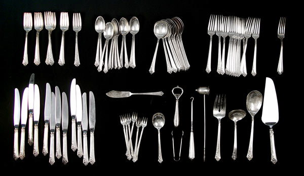 HEIRLOOM DAMASK ROSE STERLING FLATWARE SET: 73 pieces in the Damask Rose pattern by Heirloom (Oneida) to include 12 dinner forks (7 1/8''), 12 salad forks (6 1/2''), 12 teaspoons (6 1/8''), 12 soup spoons (6 1/2''), 12 dinner knives (8 7/8''), solid master butter knife (7''), 6 cocktail forks (5 1/4''), table spoon (8 1/2''), shell sugar spoon (6''), gravy ladle (6 3/8''), serving fork (8''), cake server (10 3/8''), sugar tongs (3 1/4''). No monograms on above pieces. Set also comes with Concord Silver bottle opener (5 1/4''), Lunt candle sniffer (9 1/4''), Reed & Barton fork (7'', monogrammed) and a unknown maker shoe hook (7 5/8''). Approx. 78.5 troy oz. Comes in a wood silver chest with decoupage child on top, measures 5 1/2'' high x 19 1/2'' x 11''