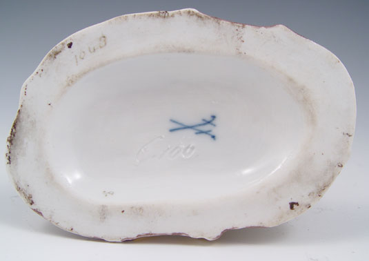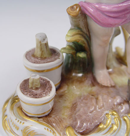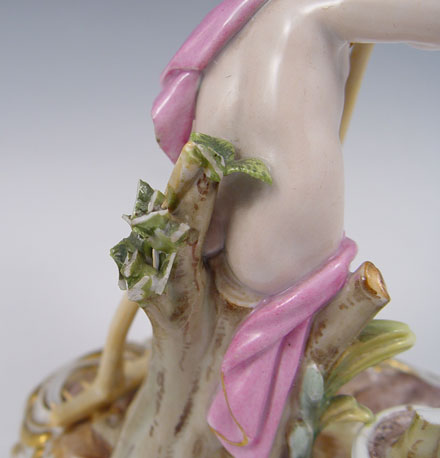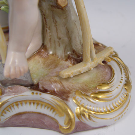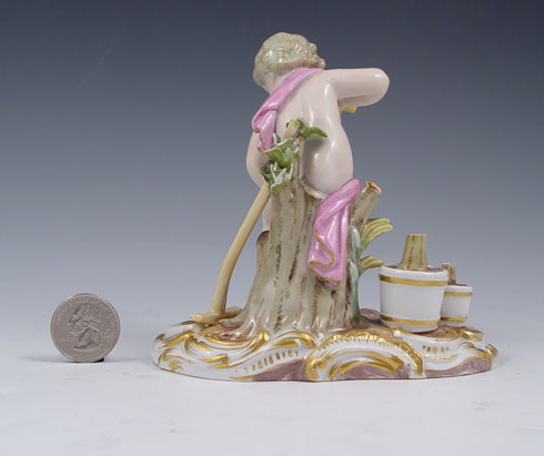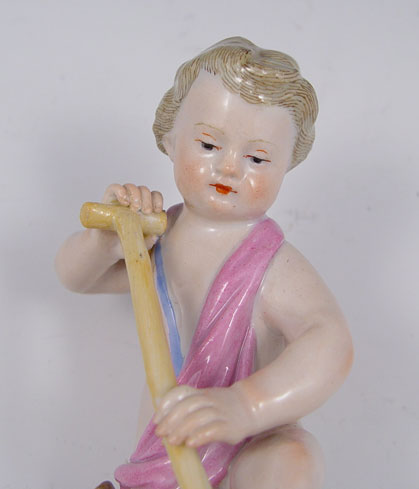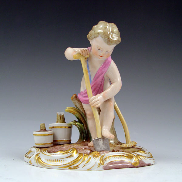 MEISSEN FIGURE OF PUTTI WITH GARDEN SHOVEL: Blue cross swords mark, 5''h., the base is 5 7/8''w. Please note loss of flowers in pot.