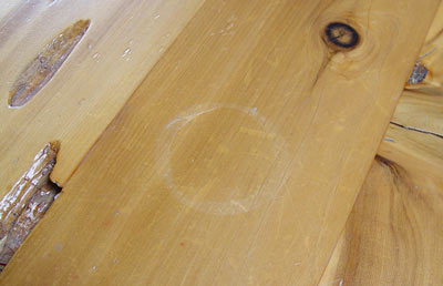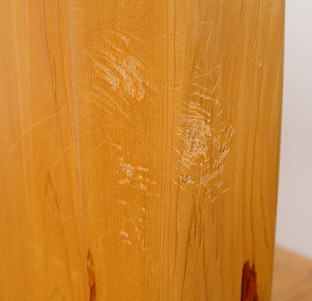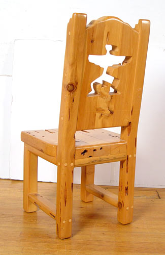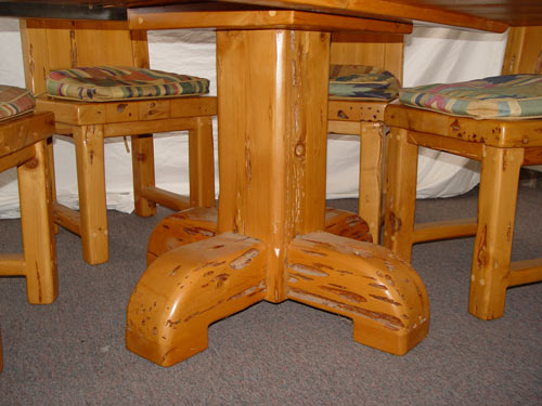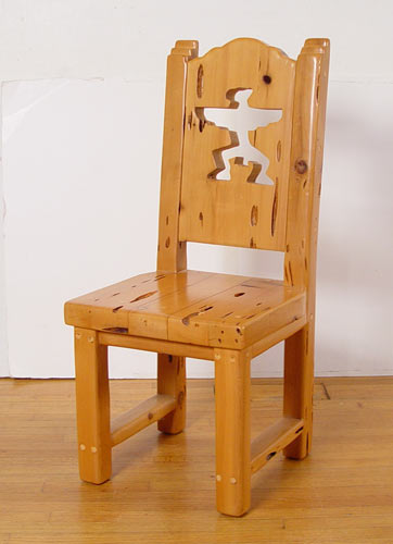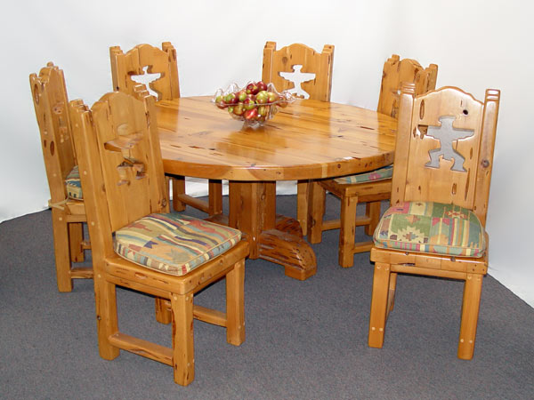SCOTTSDALE ART FURNITURE CO. PECKY CYPRUS TABLE & CHAIRS: 6' round table with heavy cyprus base. 6 custom made chairs with thunderbird cut out decoration, each with a pillow seat cushion.