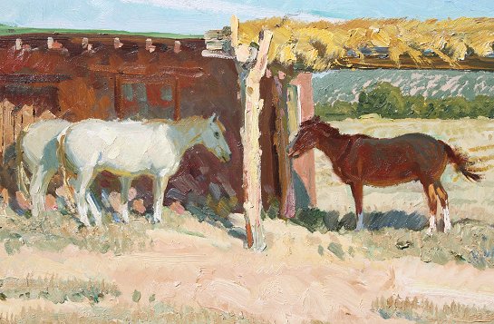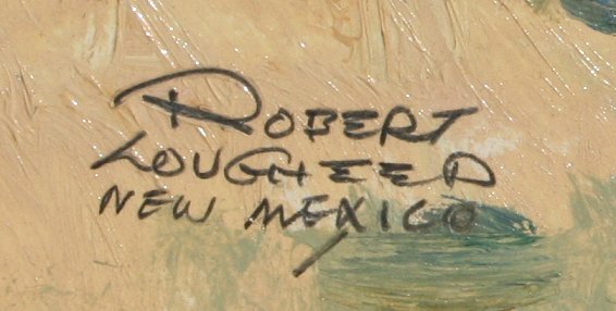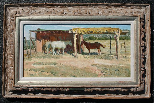 LOUGHEED, Robert Elmer, (American, 1910-1982): ''The Remada Shade'', Oil/Board, 12'' x 24'', signed, marked New Mexico lower left, titled verso and signed, custom carved wooden frame, 21 1/2'' x 32 1/2''. Acquired from the Nedra Matteucci Gallery, also included in the artist's catalog raissonne. Est. $15000/25000**
