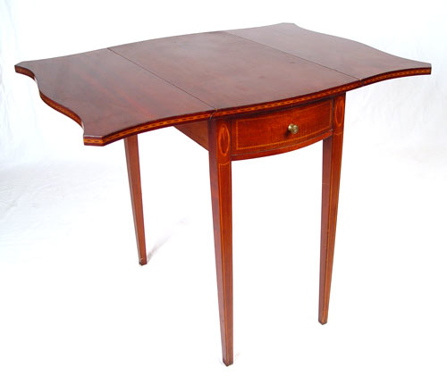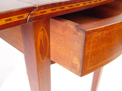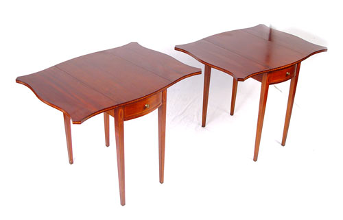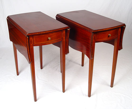 PAIR PARQUETRY INLAY MAHOGANY PEMBROKE TABLES: Shaped drop leaves, measure 27 1/4'' high x 25'' x 15 1/2'' with leaves down.