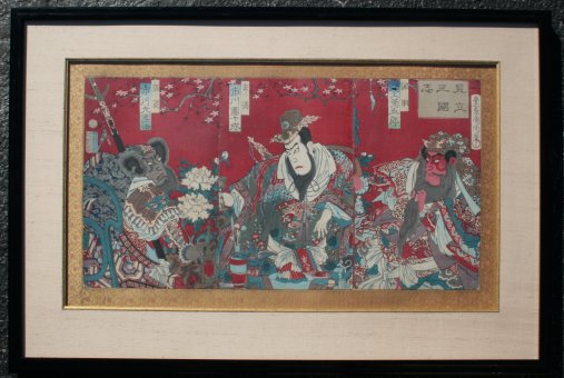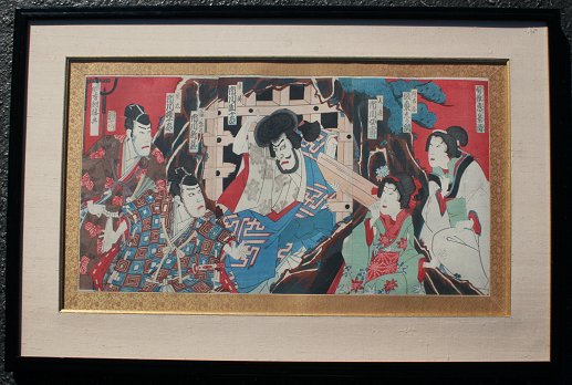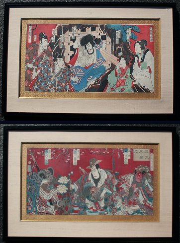 PAIR OF JAPANESE MEIJI PERIOD KABUKI ACTORS WOODBLOCK PRINTS: Triptychs measure 13 1/2'' x 26 3/4'' and 23 1/2'' x 37'', both custom framed original silk backing, 14 1/4'' x 27 1/2'' and 24 1/4'' x 38''. Sold as is, not examined out of the frames.