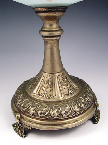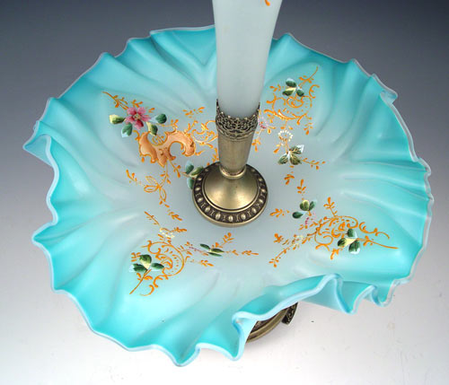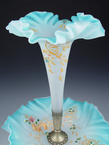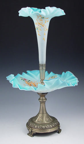 VICTORIAN ENAMELED SATIN ART GLASS EPERGNE / VASE: Trumpet vase over bowl, both are blue fading to white with polychrome decoration and ruffle edges. Silverplate mounting. 19''h., 10 1/2'' dia.