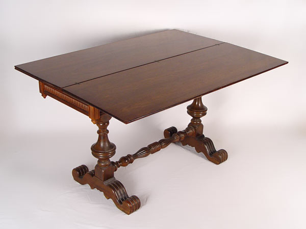 DECO ERA SOFA, DINING OR LIBRARY TABLE: Narrow table, the top flips and slides to convert to a larger table. Self storing table pads. Measures 31 1/4'' high x 19 3/4'' wide x 54'' deep.