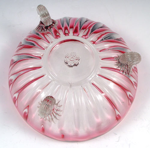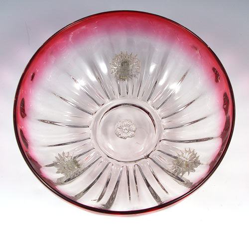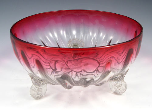 SCROLL FEET CRANBERRY GLASS BOWL: Fine glass bowl, cranberry fading to clear. Applied floral form over the pontil. 8 3/4'' dia. 4 1/2''h.