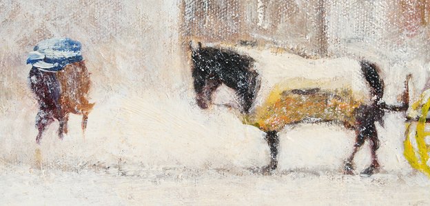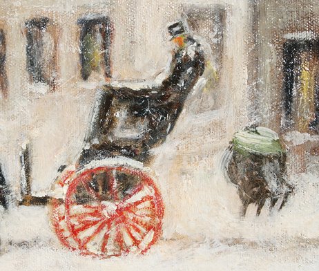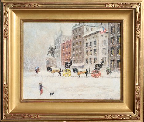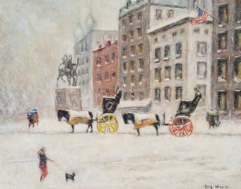 WIGGINS, Guy Carleton, (American, 1883-1962): NYC Plaza Snow Scene, Oil/Canvas, 16'' x 20'', signed, heavy carved and gilded American Impressionist reproduction frame, 24 1/2'' x 29''. Several very minor touches of inpaint, visible by blacklight only, restretched, several sporadic minor lines of cracklure. Est. $15000/25000**