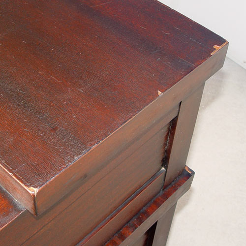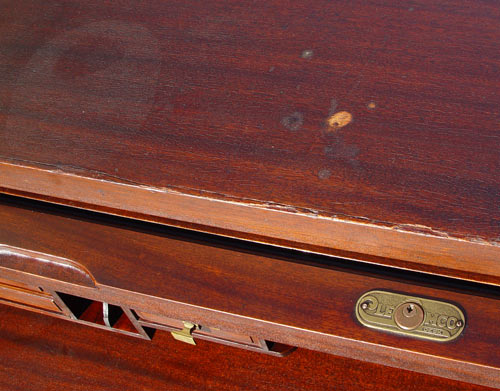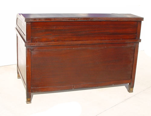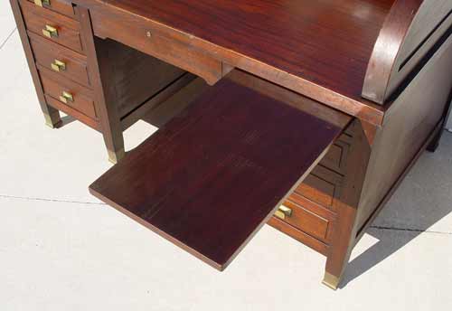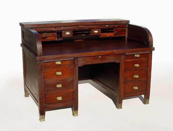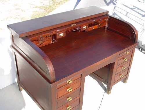 LARGE MAHOGANY ''C'' ROLL TOP CLEMCO DESK: The Clemetson Co. Chicago Executive desk with C roll top, interior drawers and cubicles. Drawers fitted with adjustable dividers, one with card size file. One legal size drawer. Slightly alligatored finish. 42''h. x 60'' x 38''.