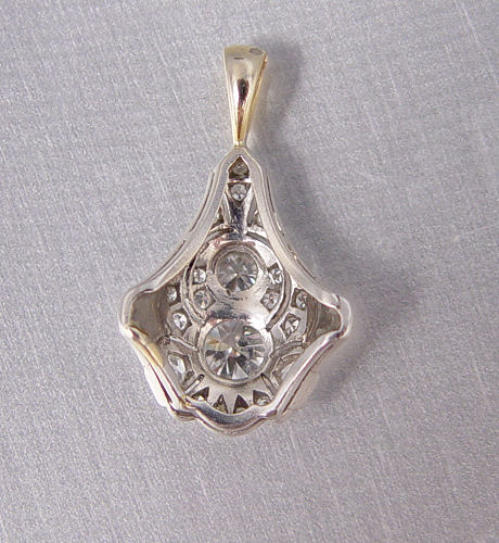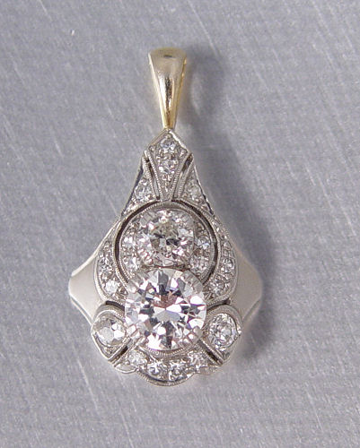PLATINUM AND 1.5 CTW OLD EURO AND MINE CUT DIAMOND PENDANT: A fine platinum pendant featuring an approximate .66 ct. transitional round brilliant diamond, VS1 in clarity, H color. There are also two old European round cut diamonds, one old mine cut, and sixteen round single cut diamonds, .50 ctw. approx. These additional diamonds average VS in clarity and H in color. The diamonds are prong set. 14K yellow gold bail attached. 1 inch long overall. 3.9 grams. Sold with current Florida Diamond Appraisers GIA graduate's appraisal for $5,200. Est. $2500/4000**