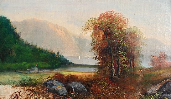 HUDSON RIVER SCHOOL PAINTING: Oil/Canvas, 20'' x 33 1/2'', Closely resembling the style of William Hart, possibly a Hudson River or Lake George Scene, later signature added lower left. Several scattered tears and abrasions, with minor sporadic inpaint, skinning evident, will require restoration and cleaning, but certainly worth it. Est. $800/1200**