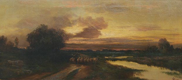 PLATT, Charles A., (American, 1861-1933): Landscape with Shepherd and Flock along a canal at sunset, OIL/C, 18'' x 40'', signed, contemporary frame with wear, 26'' x 48''. Condition - Needs cleaning, several minor areas of spot in-paint. Est. $1500/2500**