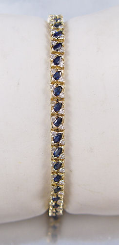 14K 5.00 CT SAPPHIRE & DIAMOND BRACELET: 14K yellow gold bracelet contains 41 oval mixed cut sapphires. Total weight approx. 5.00 Ct. Rated SI in clarity (Type II), B in Hue, 7 in Tone and 3 in Saturation. There are also approx. 82 round full cut diamonds. approx. total weight of 1.25 Ct. The diamonds average VS-SI in clarity and H-I in color. The sapphires and diamonds are prong set. Hidden closure with figure eight safety clasp. Weight: 13.4 grams. Length: 7''