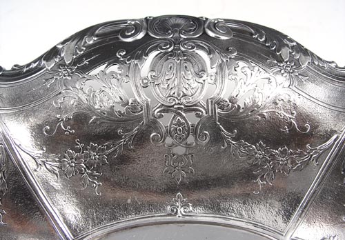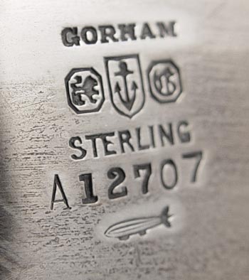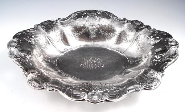 1929 GORHAM REPOSSE & OPENWORK CENTER BOWL: Repousse and openwork center bowl marked Gorham A12707 with 1929 Zeppelin date mark. Note piece has been lacquered, monogrammed. Measures 3'' high x 13 3/8'' x 10''. Approx 27.6 troy oz.