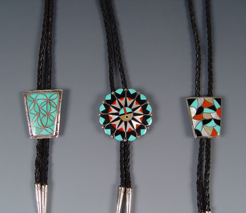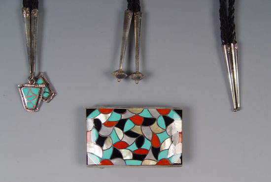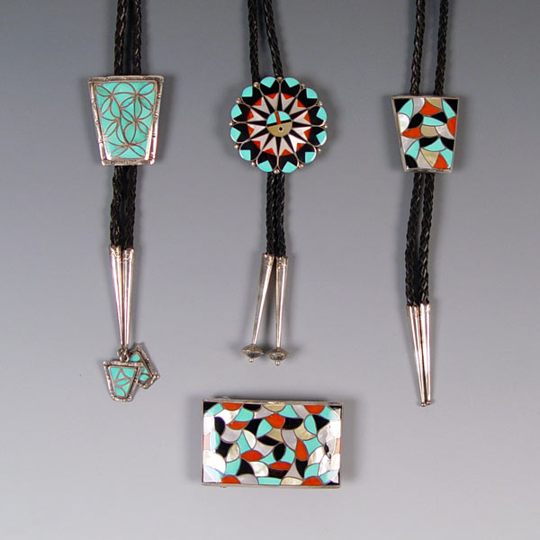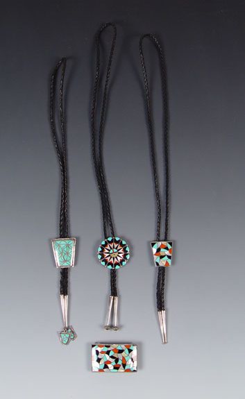 4 PIECE ZUNI STERLING TURQUOISE & STONE BOLO TIES: 4 pieces to include 1) Turquoise, coral, mother of pearl and other stone medallion shape. Saucer tips. Signed Delwin Gasper Zuni 99. Measures 2'' dia. 2) Turquoise trapezoid form with turquoise bangle tips. Signed L. Hechilay Zuni. Measures 1 7/8''. 3) Turquoise, coral, mother of pearl and other stone trapezoid form with matching belt buckle. Signed ELB. Bolo measures 1 5/8'', buckle measures 1 1/4'' x 2 7/8''.