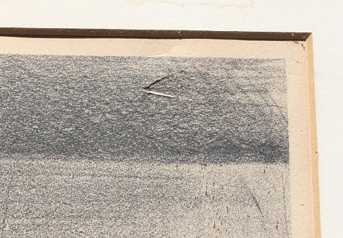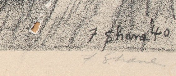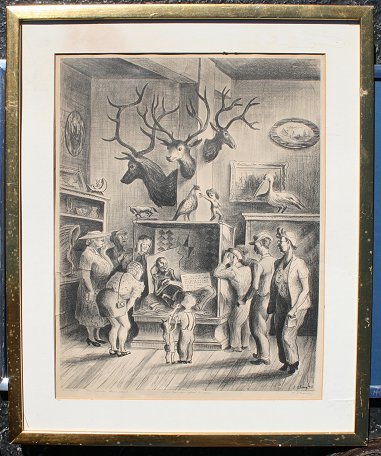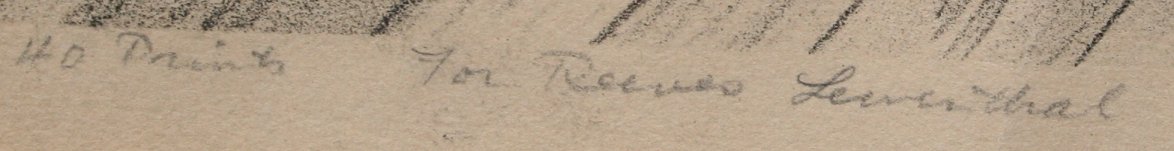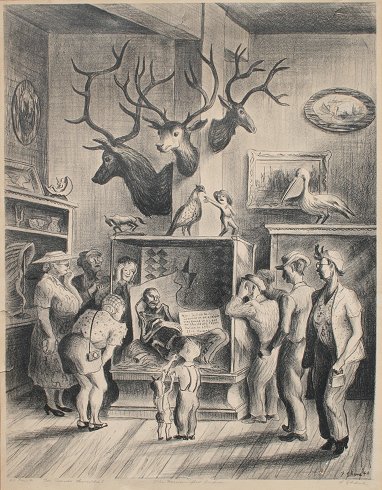 SHANE, Frederick Emmanuel, (American, 1906): ''The Mummified Indian'', Lithograph, sight size 18 1/4'' x 14 1/4'', pencil signed and titled, also signed in the plate and dated '40, pencil indication 40 prints and for Reeves Lewenthal, gold frame with wear, 23 1/2'' x 19 1/2''. Condition - Missing glass, scattered tears throughout, water staining to right margin and to mat, small fleck of paper missing from right corner, some tears and an indentation in left margin, minor mat burn. Sold as is. From the Lewenthal Collection.