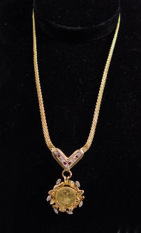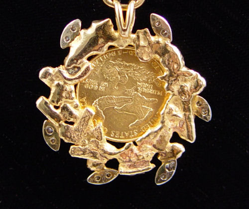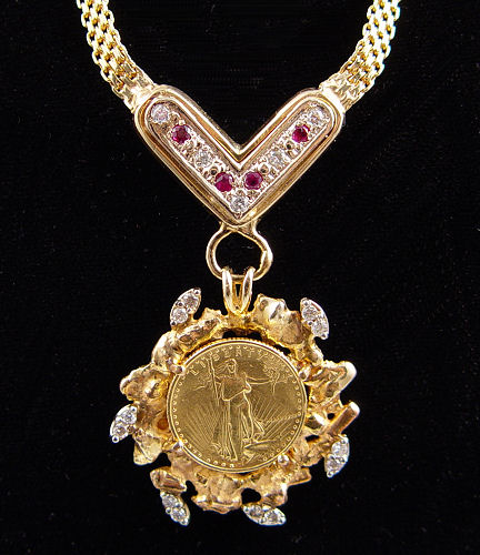 14K US 5 DOLLAR EAGLE 1/10 COIN DIAMOND NECKLACE: 14K yellow gold nugget style coin bezel contains a US 5 dollar Eagle 1/10 coin. 17 round full cut diamonds. Weight: .45 Ct. Approx. The diamonds average VS-I1 in clarity and H-I-J in color. 4 round mixed cut rubies. Weight: .20 Ct. Approx. All stones are prong set. Fancy link chain. Overall length: 18'' Weight: 23.0 grams.