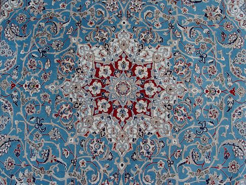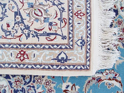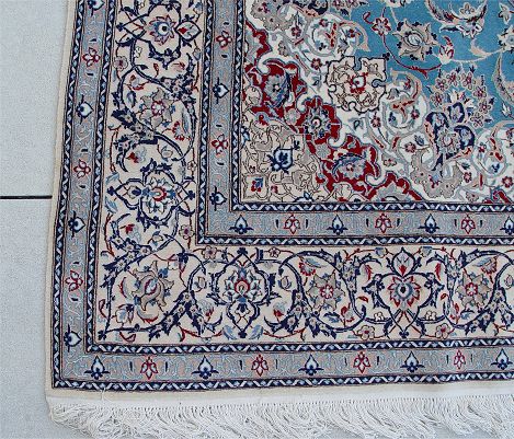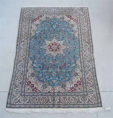 FINE HAND TIED NAIEM CARPET: Approx. 8' X 5', blues on cream.