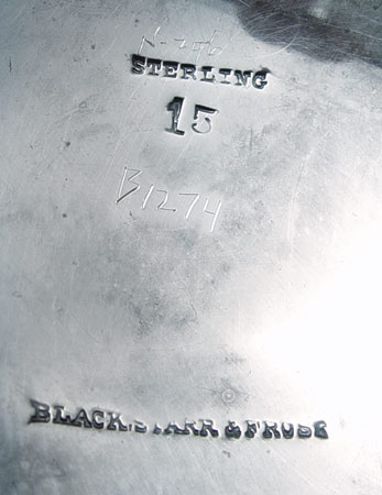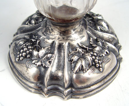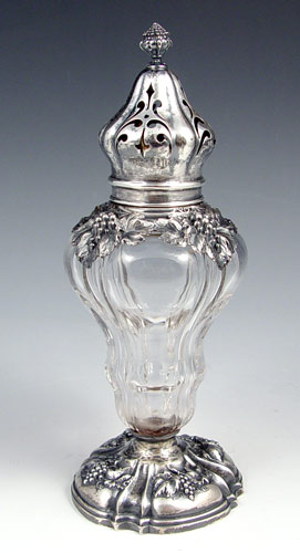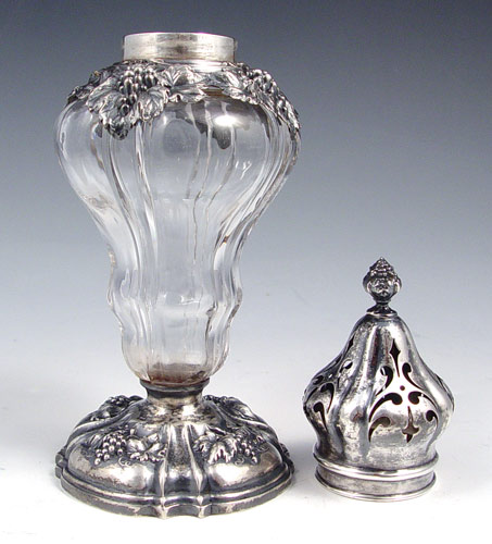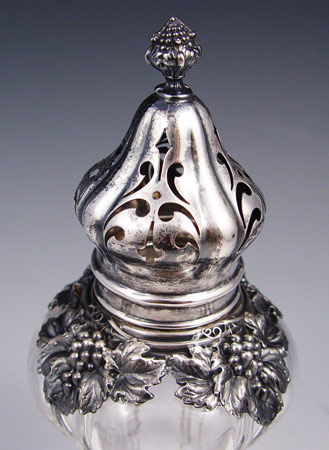 BLACK STARR & FROST STERLING & GLASS MUFFINEER: Grape leaf design muffineer marked Black, Starr & Frost Sterling 15 on base. Measures 8 1/4'' high x 3 1/4'' wide. Will need cleaning, note lean.