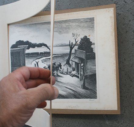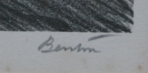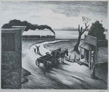 BENTON, Thomas Hart, (American, 1889-1975): ''Edge of Town'', Lithograph, signed, size with margins 10 3/4'' x 15'', pencil signed, framed, 15 1/2'' x 18'', AAA label verso, with David Bendann's Fine Art Room. Glued to backing, several scattered spots of foxing. Est. $2000/4000**