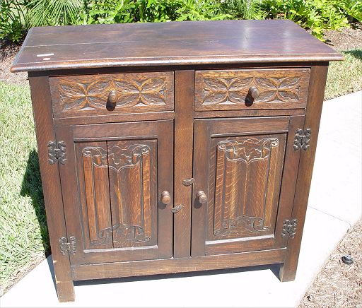 CARVED OAK SIDE CABINET: Relief carved drawers over linen fold carved doors, Measures 33'' high x 36 1/4'' wide x 17'' deep. Split formed in top.