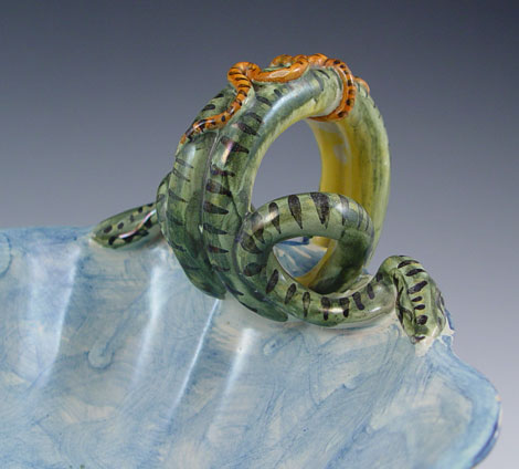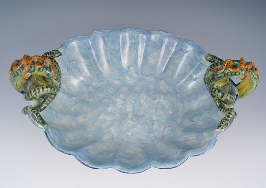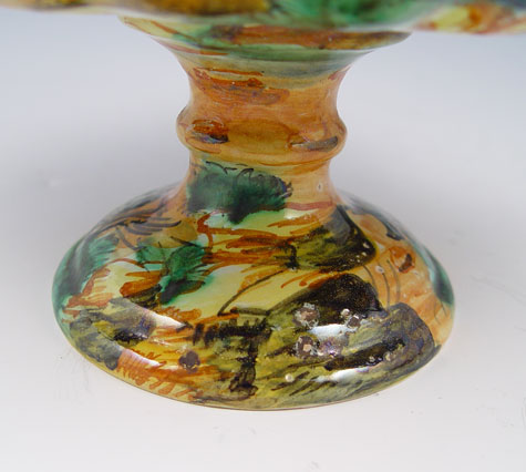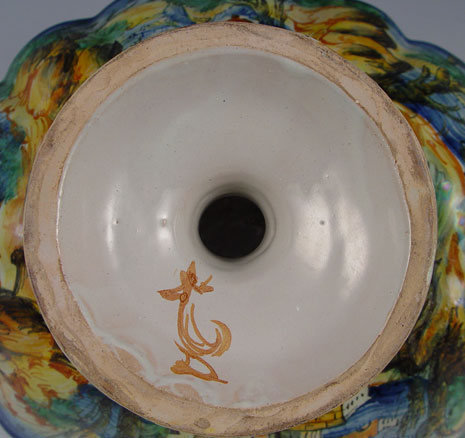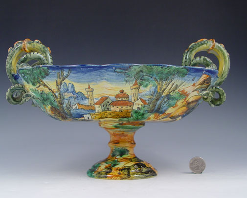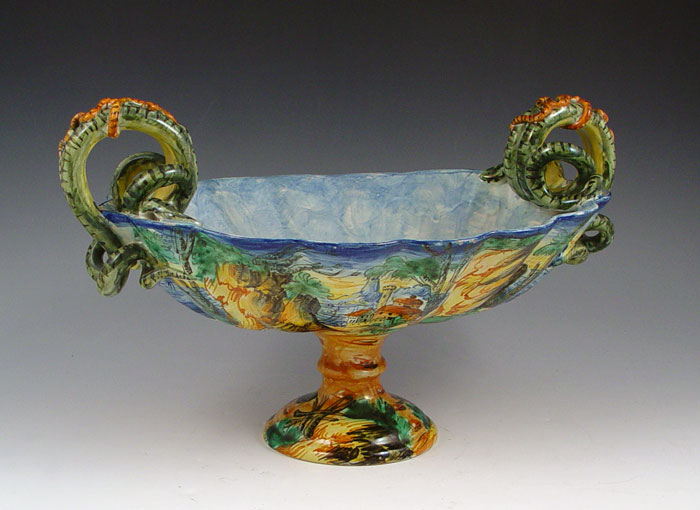 CANTAGALLI ITALIAN CERAMIC PEDESTAL CENTER BOWL: Serpent form double handles, Hand painted scenic interior. Rooster mark on the underside. 8''h. x 13 1/4''.