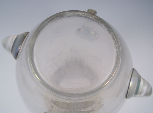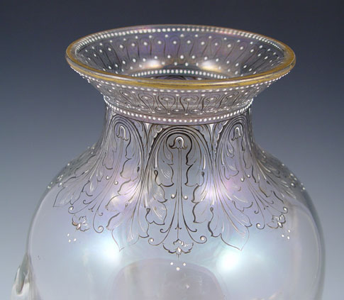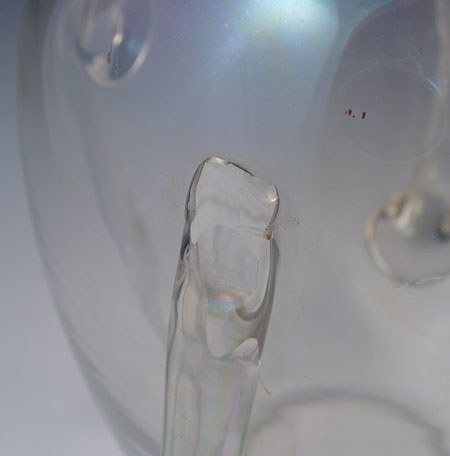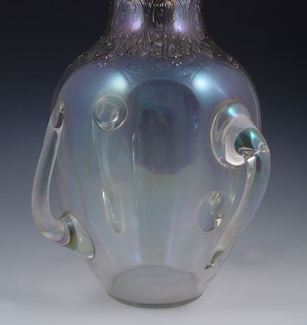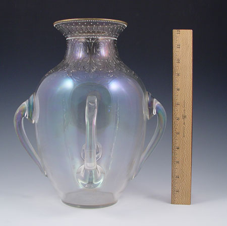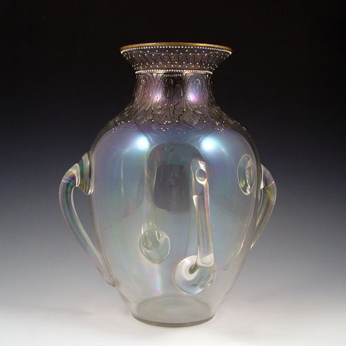 IRIDESCENT BLOWN GLASS 4 HANDLED VASE: Measures 12 1/2'' high x 8'' dia.