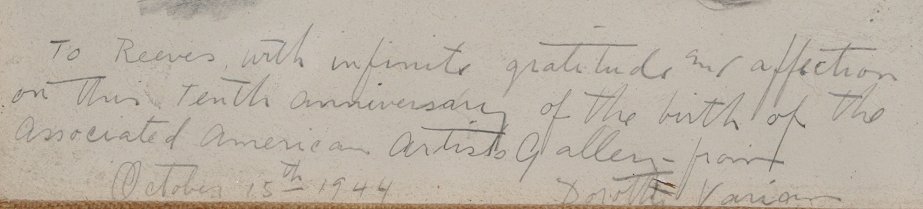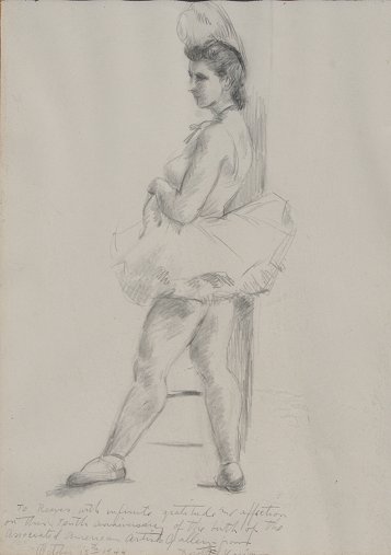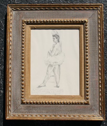 VARIAN, Dorothy, (American, 1895-): Ballerina, Pencil Drawing, 12'' x 9'', pencil signed, dated Oct 15, 1944, gilded and carved frame, 20'' x 16 3/4''. Dedicated to Reeves (Lewenthal Founder of Associated American Artists Print Co.), with infinite gratitude and affection on this 10th Anniversary of the birth of the AAA Gallery from Dorothy Varian.